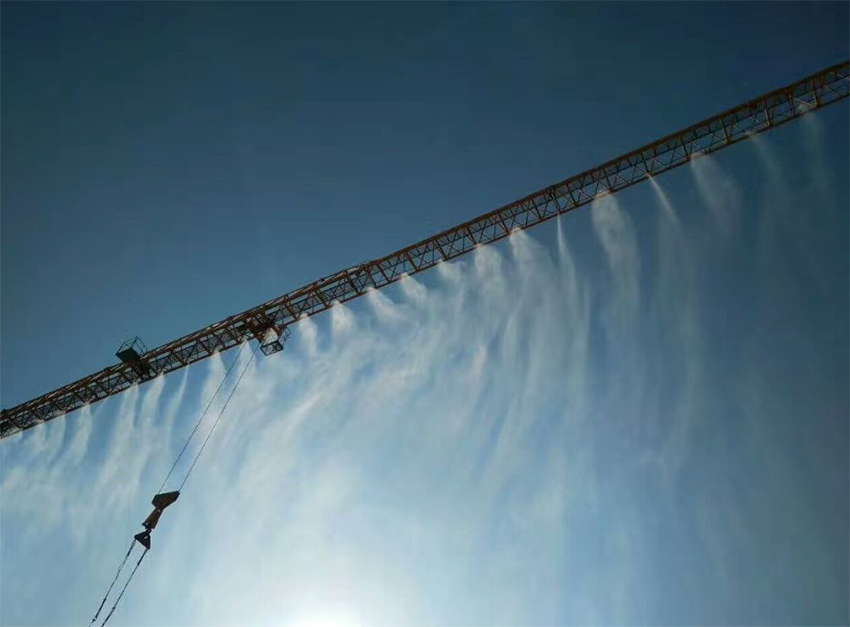 塔吊橫臂始終在工地的至高點,噴水系統(tǒng)在塔吊的旋轉(zhuǎn)范圍內(nèi)進(jìn)行全方位、零死角霧狀噴水,水通過噴嘴射出飄飛的水霧,可有效吸附空中的灰塵顆粒和雜質(zhì),可以控制工地?fù)P塵不往外擴(kuò)散,起到降塵的作用,同時在高空噴淋一段時間后,地面將形成一片濕潤狀態(tài),能有效的壓制住灰塵重新?lián)P起。
